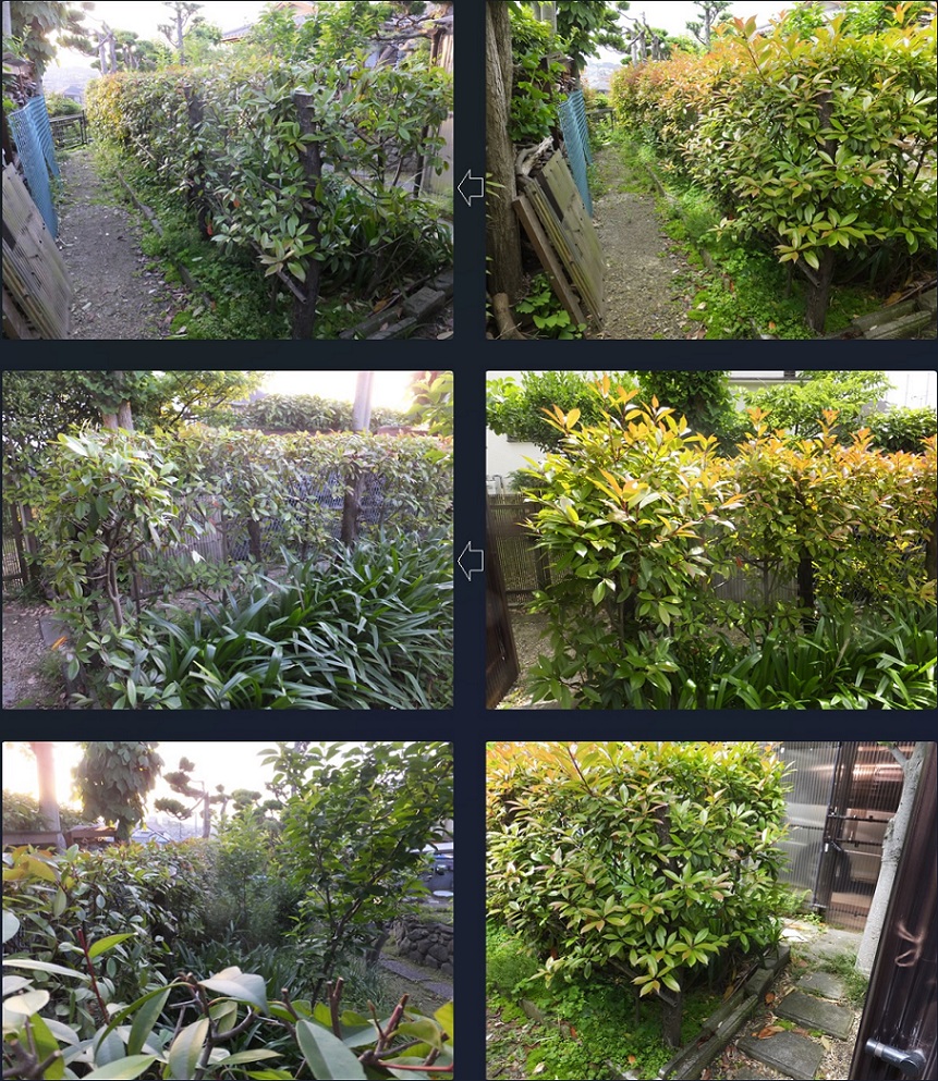 庭の奥の小道にある赤かなめを選定しました。 やっと垣らしくなってきました。
