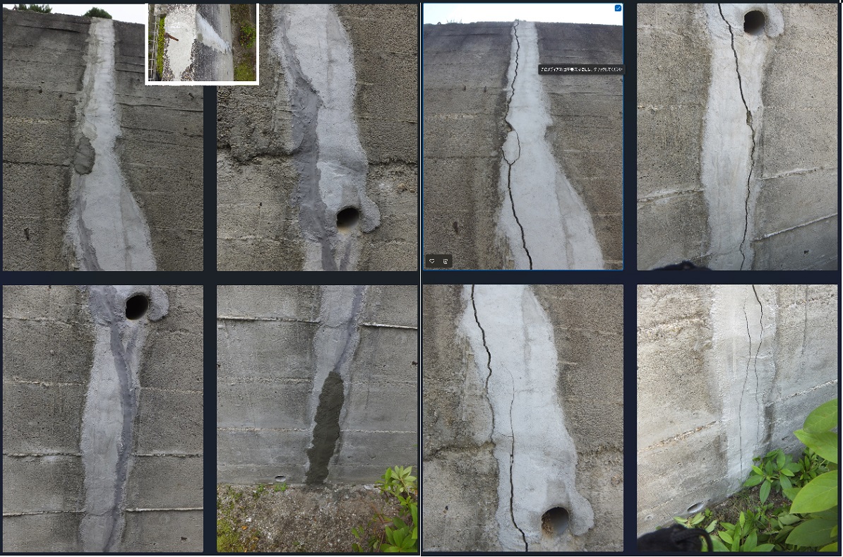 擁壁の一カ所だけひび割れをしている。 上部は1cmぐらい下部は1mm程度。