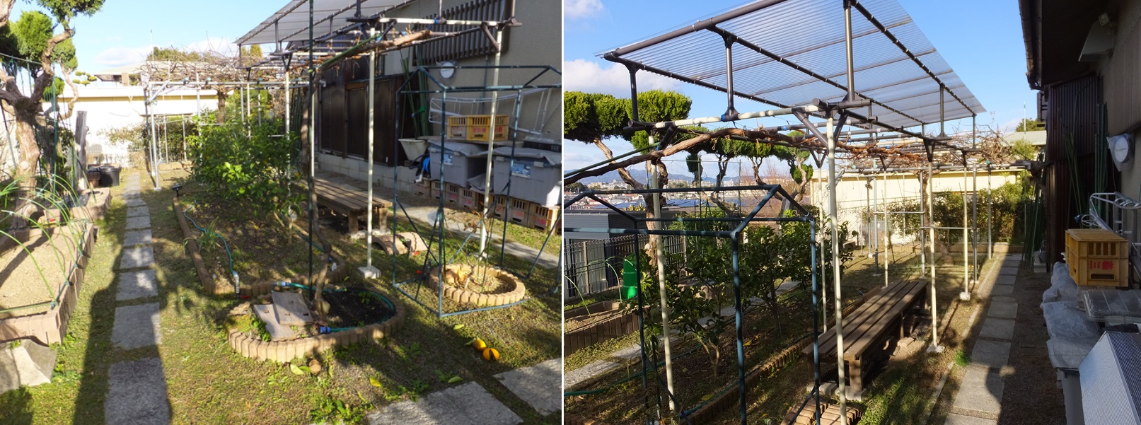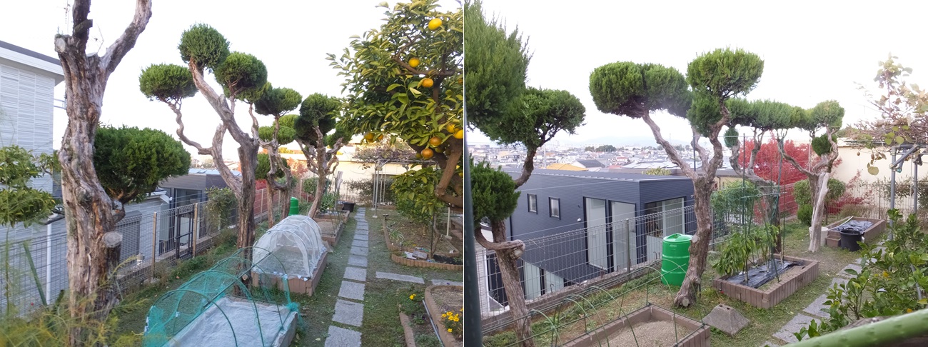 擁壁西側と庭の奥のカイズカイブキ8本 これですっきり。
