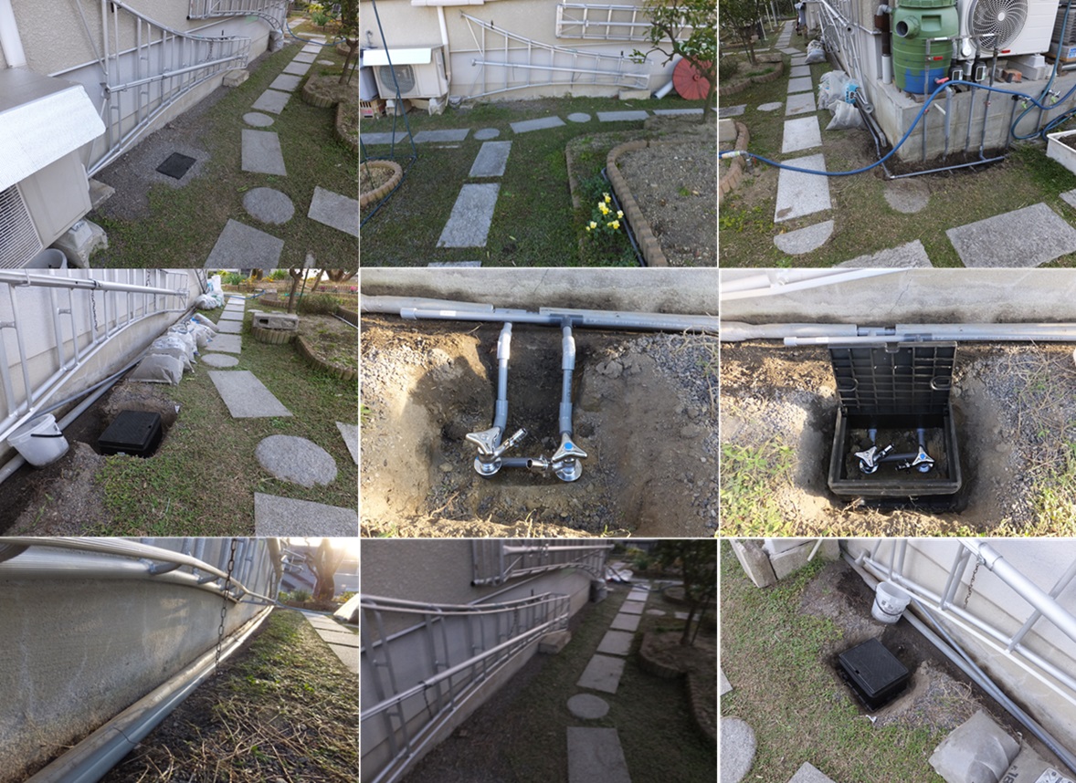 井戸水は、すでに敷設されており、途中から取り出す。池の水は、時間設定ができる調整弁より延長させる。