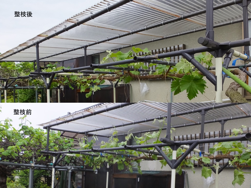 水槽の製作に没頭している間にぶどうの枝が、伸び切っている。慌てて整枝・剪定・誘引を行う。昨年度は、摘果しなかったため小さな粒がいっぱいなった。味は良かったのだが・・・・ 今年は、ちゃんと摘果を行おう